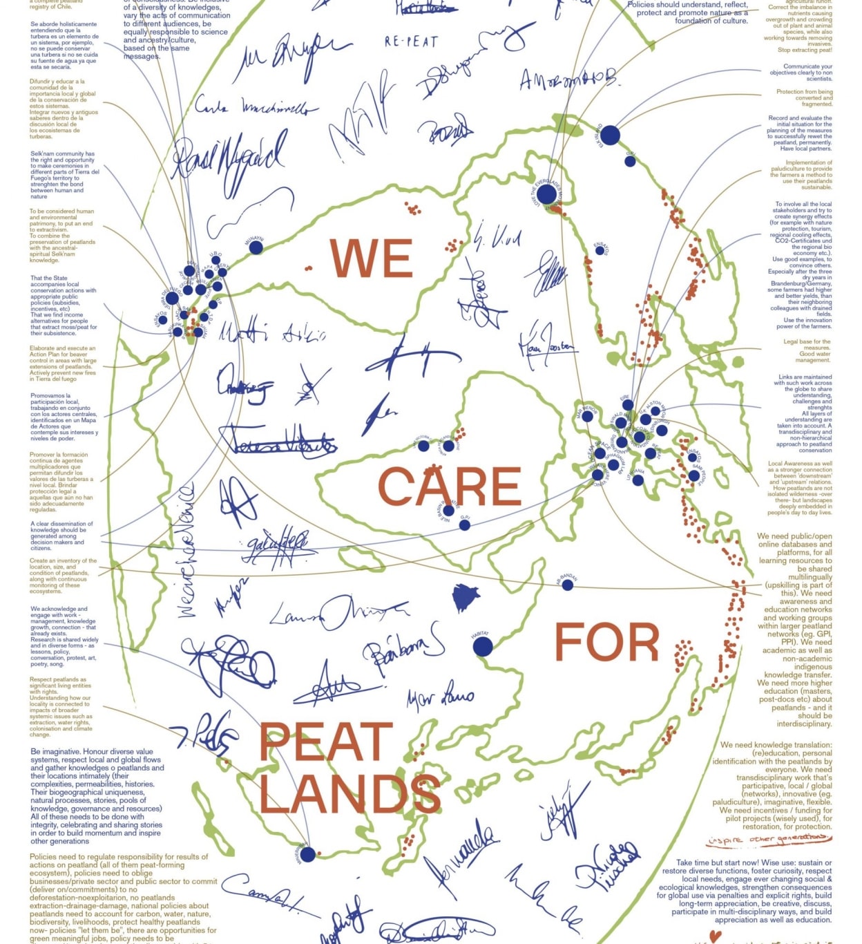 Este logro es igualmente el resultado de quienes compartieron generosamente sus conocimientos en persona, dando fuerza encarnada al proceso de acuerdo, y de los participantes de once talleres sobre el terreno que presentaron sus aportaciones días antes de reunirse en Venecia. Estos «nodos» remotos trabajaron con un kit de herramientas para el acuerdo que recogía la diversidad de enfoques locales para la valoración y protección de las turberas en todo el mundo, en el Parque Karukinka y Ushuaia (Tierra del Fuego), la Isla del Alce (Canadá), los Everglades (Florida), Alston Moor (Reino Unido), Aysén, Puerto Varas y Chiloé (Chile), Brandenburgo y Greifswald (Alemania), y Minjerribah (Australia). El esfuerzo del Acuerdo de Venecia pretende seguir añadiendo localidades y firmantes en los próximos años. Este objetivo está en consonancia con el trabajo de la Iniciativa Mundial sobre las Turberas, cuya coordinadora en ONU Medio Ambiente, Dianna Kopansky, estuvo presente en Venecia. En sus palabras: «Reforzar las relaciones entre los expertos locales y los responsables de la toma de decisiones a nivel mundial es vital para el futuro».